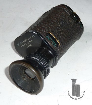 | Beim "Triëder Monocle" befindet sich die Seriennummer mit auf dem oberen schwarz lackierten Deckel des "Mantels" (h): hier 148760. Demnach müsste das Glas 1908 hergestellt worden sein. Dem Zeitraum entspricht auch die weitere Deckelbeschriftung nur mit der Vergrößerungsangabe "6x". Die komplett umlaufende Dioptrienskala ist bei Null und jeweils + und - Fünf markiert. Die Art der Befestigung der Augenmuschel durch einen inneren Gewindering (a) erlaubt auch, dass sich beim Fokussieren das Okular dreht, die Hartgummiaugenmuschel am Auge jedoch nicht, so das das Glas nicht von der Augenhöhle weg genommen werden muss. Wie beim Goerz 9x gibt es oben am Gehäuse eine von innen angeschraubte Trageriemenöse in Drahtbügelform und unten seitlich am Deckel (g) eine weitere zum Einhaken eines Riemenlochs, um ein Tragen ohne Schlenkern des Monokulars zu erlauben. Die Objektivlinse (d) ist um 10mm nach innen versetzt, so dass durch die Fassung eine Sonnenblende gegeben ist. | The serial number on the "Triëder Monocle" is inscribed on the top cover of the hosuing (h): here 148760. So, the glass must date from 1908. This production date also corresponds with the other inscriptions, i.e. only being marked with its magnification of "6x". The full dioptre scale is marked at zero and +/- five. The construction of an inner retainer ring (a) holding the eyecup allows to keep the eye to the eyecup while focusing, because only the eyepiece not the eyecup rotates. Just like Goerz 9x the housing of the 6x comes with a strap lug on the upper side of the housing - it is a wire lug screwed on the wall from the inside - and comes with another hook-like lug on the side rim of the lower cover plate (g) to attach the strap with some opening. This allows carrying the monocular without dangling around. The objective lens (d) is recessed by 10mm into the housing so that the frame builds a kind of rayshade. |