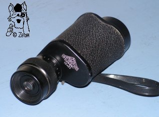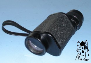 | Das 10x32 Monokularmodell von Hertel & Reuss aus Kassel ist ein typisches Porroprismen-Glas mit blauer Vergütung aus den 50-70er Jahren. Es ist aus Aluminium mit einer Rauhlack-Ummmantelung und unverschraubten, schwarz lackierten Deckeln. Das Okular ist mit einem umlaufenden und von + bis - 5 markierten Dioptrienausgleich ausgestattet und hat eine Kunststoffaugenmuschel. An der Trageöse befindet sich ein kleiner Hand-Trageriemen. |