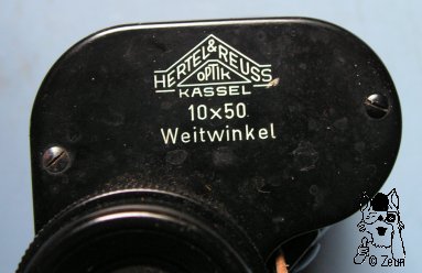 | Das 10x50 Hertel & Reuss Monokular hat eine Vergütung und ist bei einem Modell als "Weitwinkel" auf dem oberen Deckel gekennzeichnet. Das Gehäuse hat einen Stativadapter und ist mit schwarzem Leder ummantelt, so auch der Objektivtubus. Das linksseitige Okular hat eine umlaufende Dioptrienskal mit Bezifferungen bei Null und +/-5 | This 10x50 Hertel & Reuss monocular is coated and one model is marked on the top cover as being a "Wide Angle" type. The housing is equipped with a tripod adapter and covered with black leather just like the objective tube. The left-hand sided ocular has a full circle dioptre scale with number at zero and +/-5 |