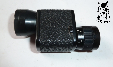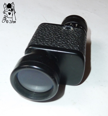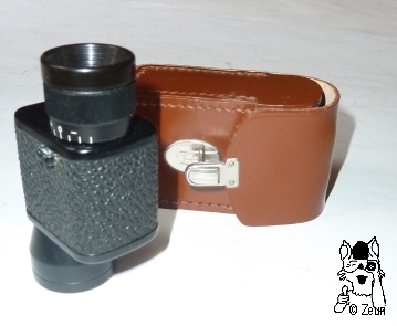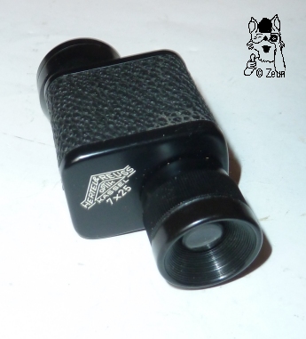| Dieses Hertel & Reuss 7x25 Monokular ist ein Porro-1-Modell mit einem kastenförmigen Korpus aus der "Peer" Modellreihe. Es ist mit strukturiertem Hartgummi ummantelt und hat eine kleine Trageriemenöse. Die schwarz lackierten Alugehäusedeckel sind unverschraubt. Der obere ist mit dem Firmenlogo und der Modellbezeichnung "7x25" beschriftet. Am unteren Deckel befindet sich ein kurzer konischer Objektivtubus (vgl. H&R "Peer" 8x30). Das rechtsseitige Okular* hat eine flache Metallaugenmuschel (diese ist Teil eines herausschraubbaren Okularlinsensystems) und eine Dioptrienskala mit Strichen von plus bis minus 3. Die Optik ist blau vergütet. | This Hertel & Reuss 7x25 monocular is a porro 1 model from the "Peer" series with a rectangular housing. This is covered with textured hard rubber. There is a tiny strap lug. The black painted aluminium cover plates have no screews. The top one is marked with the firm's logo and "7x25". The conical objective tube is shorter than with the H&R "Peer" 8x30. The right-hand sided* eyepiece has a flat metal eyecup - which is part of the unscrewable ocular lens system - and has a dioptre scale ranging from plus to minus three. The optics are coated blue. |