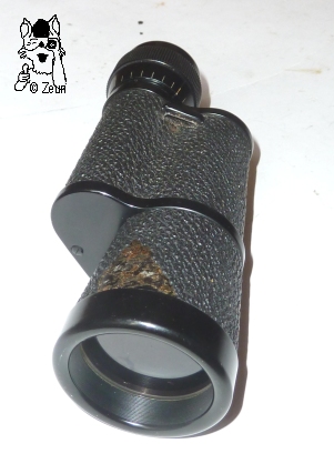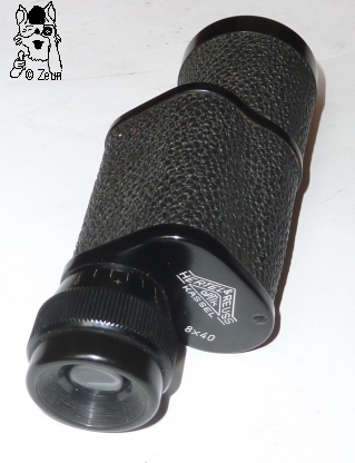 | Das blau vergütete 8x40 von Hertel & Reuss ist schwarz lackiert, hat eine Vulkanitummantelung, einfach verschraubte Deckel sowie einen langen, konischen Objektivtubus. Das Okular hat eine Kunststoffaugenmuschel und einen komplett umlaufende Dioptrienausgleich mit Kennzeichnungen bei +/- 5. Der obere Deckel ist außer mit dem Firmennamen und -logo mit "8x40" schräg zum Logo postitinoniert gekennzeichnet. | The blue coated 8x40 by Hertel & Reuss is painted black, has an ebonite covering, covers with only one screw, and a long conical objective tube. The eyepiece has a plastic eyecup and a full dioptre scale with markings at +/- 5. Besides the company's name and logo, the top cover is marked with 8x40 postitioned diagonally to the logo. |