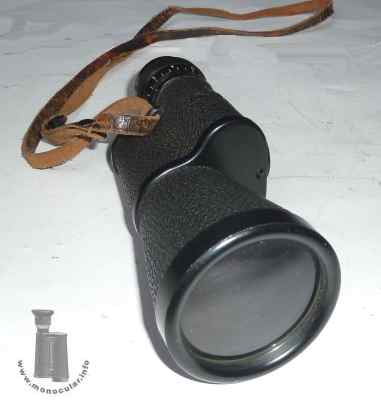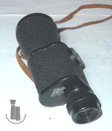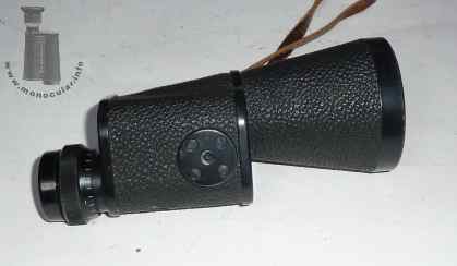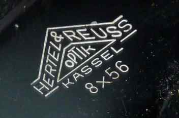 | Das 8x56 von Hertel & Reuss hat eine vergütete Optik, ist schwarz lackiert, hat eine Lederimitatummantelung und einfach verschraubte Deckel. Das rechtsseitige Okular hat eine Kunststoffaugenmuschel und eine komplett umlaufende Dioptrienskala mit Markierungen bei Null und + bzw. - 5. Der obere Deckel ist außer mit dem Firmennamen und -logo sowie "8x56" beschriftet. Am Gehäuse befindet sich ein Stativadapter. | The 8x56 by Hertel & Reuss has coated optics, is painted black, has a fake leather covering, and covers plates with one screw. The rtight-hnd sided eyepiece has a plastic eyecup and a full dioptre scale marked at zero and +/- 5. The top cover is isncribed witht eh company's name and logo as well as with "8x56". The housing comes with a tripod adapter. |