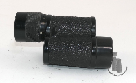 | Das "Grossfeld" Modell 6x24 wurde von Hensoldt ab ca. 1928 bis ca. 1940 gebaut. Auf dem oberen Deckel ist ein Sehfeld von 160m angegeben, somit handelt es sich um die 2. Variante ab 1933 mit etwas größerem Sehfeld als zuvor (150m). Dieses 6x24 dürfte zwischen 1933 und 1936 gefertigt worden sein. Der untere Deckel trägt das Firmenlogo und die Seriennummer 351721. Beide Deckel sind jeweils nur mit einer Schraube befestigt. Es ist ein typisches Porro-1-Prismenmonokular mit Hartgummiummantelung, schwarzer Lackierung und einem Okular mit Dioptrienausgleich - gekennzeichnet bei 0 und +/-5 - und einer Plastikaugenmuschel. Die Trageriemenöse ist am Korpus eingegossen. Das 6x24 wiegt 167g, ist 103-113mm lang und die Objektivfassung ist 34mm, das Okularstück 30,5mm, der kreuzgeriffelte Fokussierungring 35mm und die Augenmuschel 34mm im Durchmesser. |