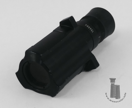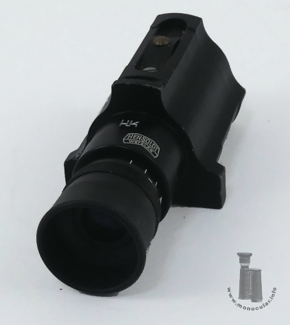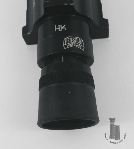 | Dieses Monokular in einer Montagefassung ist wohl identisch zum Zeiss (Oberkochen) 6x20B mit Gummiaugenmuschel. Es wurde von Hensoldt Wetzlar (Zeiss-Gruppe, Militärproduktion ab 1960er bis ca. 2000er) für Heckler & Kcoh (HK) gebaut. Das Kürzel HK ist am Tubus eingraviert, das Hensoldt Wtzlar-Prismenlogo und die Seriennummer 134564 befindet sich an Haupttubus angeschraubten Metallring. Das Monokular hat ein Schmidt-Pechan-Prsimensytem und eine blau-violette Vergütung. Es hat eine zurückklappbare Gummi-Aguenmuschel und einen Dioptrienausgleich von plus bis minus 3, der nur mit + und - sowei einem Dreicek für die Nullstellung markiert ist. Die Seriennummer ist 134564; ein weiteres Exemplar ohne Montierungsfassung hat die Nummer 134712. Vermutlich wurde das Monokular als Zielfernrohr, Ziellinien- oder anderes Prüfgerät gefertigt, worauf auch die Fadenkreuz-Strichplatte hinweist.. |