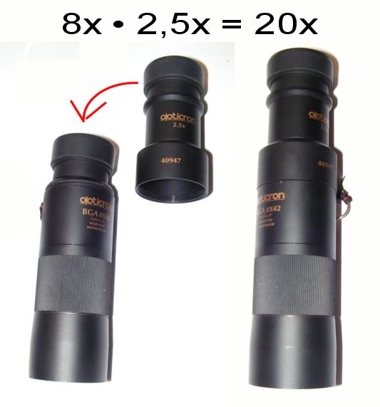 Doppler-MonokulareDer britische Vertreiber Opticron bietet das "BGA oder DBA 8x42 (10x42)-Monokular" mit einem Okular-Aufsatz (ebenfalls Schmidt-Prismenmonokular) an. Dieser auch eigenständig nutzbare 2,5x Doppler erhöht die Vergrößerung auf 20x bzw 25x, so dass man bereits ein kleines Spektiv hat. Zeiss hat sein 3,5x12 Mono, Swarowski ("Booster") und Brunton ("Epoch") haben einen ‚Doubler' für diesen Zweck (aber für Ferngläser monokular aufgesetzt gedacht). Mit angebotenen oder selbst gemachten Adaptern lassen sich diese Doppler oder auch andere kleine Monokulare für diesen Zweck verwenden. |