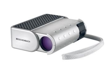 | Wie das oben erwähnte Zigarettenschachtel-große Miniaturmonokular baute und baut Nikon flache Schachtelsysteme mit Porro 1 Prismen und seitlichem Fokussierungsrad. Das aktuelle Modell hat sogar eine Vorklapplinse für den Nahbereich (Lupe). Das Eschenbach 6x18 ist seit 2006 auf dem Markt. Das Gehäuse lässt sich ähnlich wie das "Monoclair" (s.o.) zusammenschieben, um während des Transport die Linsen zu schützen. |