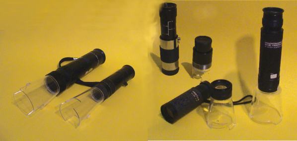 Many other Schmidt-prism monoculars by Specwell, Walters, Eschenbach, Selsi, Vixen etc. with optical specifications of 4x12, 6x18, 8x20, 10x30 feature a extra short focus under 1 meter which allows using them as a sort of magnifying glasss for near distance objects (see "Monocular Magnifiers") or for special purposes. People with visual impairments can use them for instance when looking through glass panes into displays or reading time-tables at bus stops and more. |