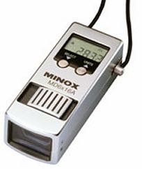 Minox makes a 6x16 and a 8x16 monocular with a sliding knob for focusing on top of the aluminium housing. The monoculars resemble Minox cameras. They have a rectangular objectie window, behind which the objective lens is moved for focusing. The 6x16A even has measuring devices incorporated (clock, thermometer, altimeter). Eschenbach has nmonoculars with a similar shape of housing, but rubber covering. moreover there are plastic versions from Chinese makers. |