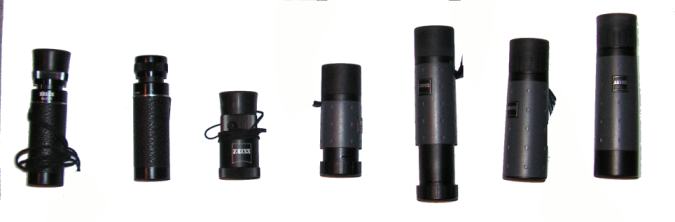 6. Schmidt Prismen MonokulareErst ca. um 1970 wurden die ersten Monokulare mit Schmidt oder Pechan-Dachkantprisma gebaut (Asahi Pentax, Zeiss ...) - ob es monokulare Modelle der wenigen Vorkriegsferngläser gab, ist nicht nachweisbar. Da sich mit ihnen eine gerade und sehr kompakte Bauweise und hohe Lichtdurchlässigkeit realisieren lässt, hat sich dieses System für die meisten aktuellen Monokulare durchgesetzt. Zeiss OberkochenZeiss begann mit als eine der ersten Firmen das Prismensystem zu nutzen. Es entstanden seitdem eine ganze Reihe an Monokularen. Die aktuellen 4x12 und 6x16 Monos haben einen Schiebe- oder Zugtubus zum fokussieren. |