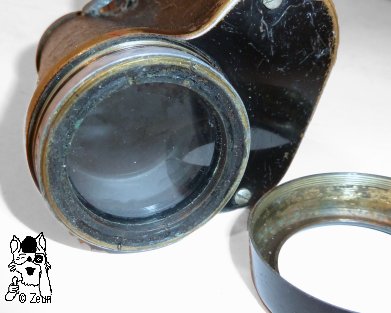 The "Trinotix" 8x30 is a porro 1 monocular. It dates from around 1930, probably 1925 (see below). Although the top cover does not carry the maker's name, the specifications are written within the Huet logo: "Trinotix - 8x30 | 8°30". Below the logo it says "MLE 1925 MILLIEMES". The model number 1925 probably refers to the date, wheras 'milliemes' stands for the 1/1000 reticle devision. The reticle is not in place any more, but a knurled ring at the eyepiece must have been intended to turn the reticle inside. The monocular is made of aluminium and brass. The housing has a leather covering and a strap lug. The objective lens is mounted with excentric rings for adjustmnet. The eyepice has a Bakelite eyecup and is marked with a +/-5 dioptre scale. Most of these features suggest that this 8x30 is a military glass. |