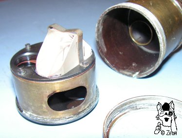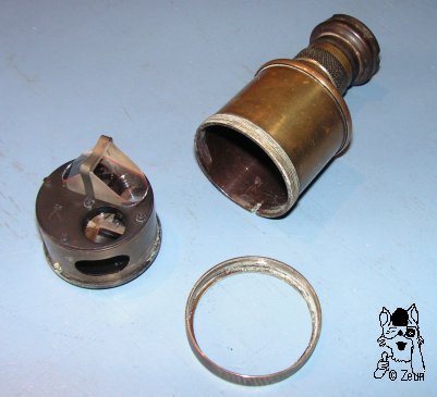 | Dieses Monokular aus Vollmessing stammt von dem Pariser Instumentenbauer A. Hurlimann. Wahrscheinlich stammt das Monokular von einem Theodoliten (evtl. 1900, s. LA GAZETTE DE GEOMUSEE) und wäre mit 550g als reines Monokular ohnehin sehr schwer zum Halten und Transportieren. Der obere Deckel trägt die Inschrift "A. Hurlimann - Ponthus & Therrode - successeurs - Paris". Das Smithonians National Museum of American History berichtet über die Firma auf der Website: "A. Hurlimann war ein Pariser Hersteller mathematischer Instrumente, der in den frühen 1890ern die Werkstatt Lorieux's übernahm und von Ponthus & Therrode ein paar Jahre später gefolgt wurde. Die Gehäusedose hat die Nummer "No. 81". Der untere Deckel ist schwarz lackiert. Das Okular hat eine Geradführung und die drehbare Augenmuschel ist aus Bakelit. Die Dioptrienskala ist zwischne plus 10 und minus 10 markiert. Wie das huet8x20ronde.htmHuet 8x20 hat das Hurlimann Monokular ein zylindrisches Prismengehäuse, bei dem sich untern ein Überwurfring abschrauben lässt und dann der gesamte Prismenstuhl mit dem Porro-1-Prismensystem herausnhemen lässt. |
