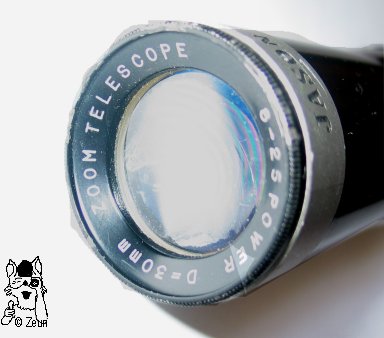 | Aus den 1960-70er Jahren stammt dieses terrestrische Teleskop oder Monokular mit Zoom. Es hat die Werte 8x - 25x und ein 30mm Objektiv (vgl. Jason Electric Zoom). Das Monokular ist aus braun lackiertem Metall und hat einen Stativanschluss - hier mit einer Klemmvorrichtung für Autoscheiben. Das Okularstück bzw. die Augenmuschel ist ebenfalls aus Metall. Mit einer Walze wird der Zoomfaktor nahe am Okular eingestellt. Zum Fokussieren wird der Objektivtubus gedreht. Die Objektivlinsenfassung ist mit "Zoom Telescope 8-25 POWER D = 30 mm" beschriftet. Der am Objektivende angebrachte silberne Zierring trägt den Markennamen "Jason" und über "Japan" das Herstellerlogo (Kreis mit drei über den Rand ragenden Strichen --> evtl. Miyauchi). | Dating from the 1960-70s this terrestrial telescope with a zooming system has 8 - 25 power and a 30mm objective (cf. Jason Electric Zoom). The monocular is made of metal lacquered brown and has a tripod thread – this one is fitted with a clamp for a car window. The eyepiece and eyecup are also made of metal. Zooming can be done with a roll adjustment located within a recess next to the ocular. The objective tube is turned for focusing. The objective frame is marked "Zoom Telescope 8-25 POWER D = 30 mm". The silvery decoration ring is inscribed "Jason", opposite to that "Japan" and bears the maker's logo: a circle with three rays reaching over the circle's outline (probably Miyauchi). |