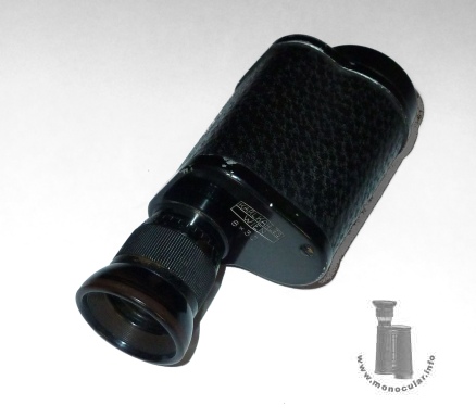 | Die Wiener Firma Kahles, vor allem für Zielfernrohre bekannt, stellte auch Ferngläser her. Hier ist ein Vorkriegsmodell, ein 8x30 Monokular mit Seriennummer 25968 am unteren Deckel. Der obere schwarz lackierte und einfach verschraubte Deckel trägt das Firmenlogo und die Spezifikation "8x30". Es ist aus Aluminium mit einem linksseitigem Messingokularstück und einer Hartgummi-Augenmuschel. | The Vienna maker Kahles, especially known for its gun-sights, also produced binoculars. Here is a pre-war 8x30 monocular with the serial number 25968 on the lower cover plate. The upper black lacquered cover fixed with one screw is marked with the company logo and its specifications "8x30". It is made of aluminium with a right-hand sided brass eyepiece and a hard rubber eyecup. |