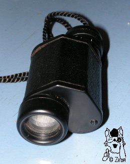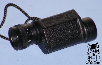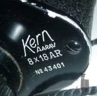 This 8x18 monocular "Alpicomo" by the Swiss maker Kern of Aarau features quite small dimensions (45x32x90mm), a trapeze shaped body and its little weight of 111g. The metal monocular is lacquered black and has a rough paint covering. There is a strap lug at the housing. The eyepiece has a dioptre adjustment ranging from + to - 3 and a flat eye-cup made of plastic. The objective tube protruding 14mm measures 25mm in diameter. So does the eyepiece. The covers have one screw. The top cover is marked "Kern Aarau 8x18 No.11313" or "Kern Aarau 8x18 No. 43401" on another model respectively. The "AR" stands for anti-reflective coating. |