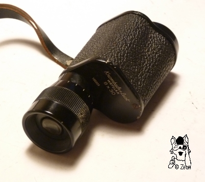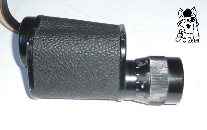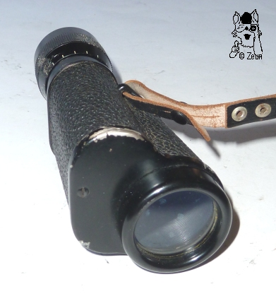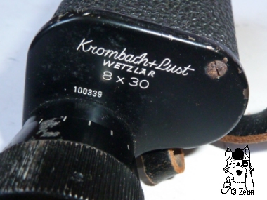| Das 8x30 ist ein vergütetes Porro-1-Monokular in der üblichen Bauweise. Die Deckel sind aus Aluminium, einfach verschraubt und schwarz lackiert. Der obere Deckel ist mit "Krombach+Lust Wetzlar 8x30 100339" beschriftet. Es ist also von Krombach Optik aus Wetzlar hergestellt, und offensichtlich mit der Markenbezeichnung "Krombach-Lust" - unter diesem Name mit Modellbezeichnung "Turnier" (vgl. Eschenbach Modelle) z.B. in einem Vertreiberprospekt der Fa. Galloways Ltd. (Birmingham, UK) aus den 1960ern. Die Dioptrienskala am linksseitigen Okular läuft rundherum, die Augenmuschel ist aus Plastik. | This 8x30 is a coated porro 1 glass with a usual design. The covers are made of aluminium, have one screw, and are painted black. The top cover is marked "Krombach+Lust Wetzlar 8x30 100339". So, the monocular was made by Krombach Optik in Wetzlar, obviously under the trade name "Krombach-Lust", and distributed under this name with model designation "Turnier" (cf. Eschenbach models) by Galloways Ltd., Birmingham in the 1960s. The dioptre scale on the left-hand sided eyepiece runs fully around the tube. The eyecup is made of plastic. |
