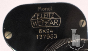 The Leitz 6x24 "Monol" model is an uncoated version from the production years between approximately 1927 to 1939. In contrast to the earlier Monol(i), it now has aluminum cover plates, secured with two screws at the top and bottom. It is inscribed with the Leitz logo on the top coverr, the model name above it, and "6x24" below it, with the serial number 137953. It was supplied with a hazelnut-brown leather case. The housing has a cast-in strap lug and a textured hard rubber coverign; the aluminum parts are painted black. The eyecup on the right-hand side eyepiece is missing on this example. The circumferential diopter scale is labeled at 0 and +/-5. |