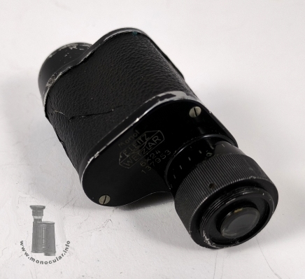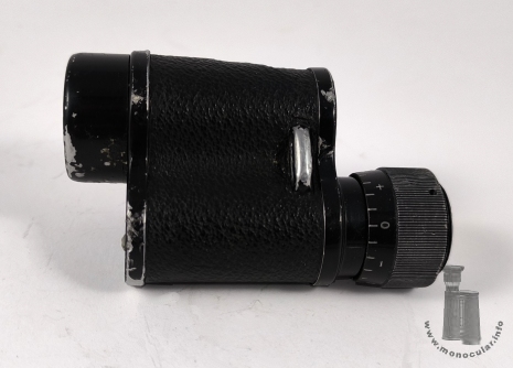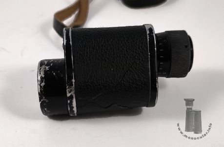 | Das Leitz 6x24 Modell "Monol" ist eine unvergütete Version aus den Produktionsjahren von ca. 1927 bis 1939. Im Gegenatz zum früheren Monol(i) hat es nun Aluminimdeckel, oben und unten jeweils mit 2 Schrauben. Es ist am oberen Deckel mit dem Leitz-Logo, darüber mit dem Modellnamen, darunter mit "6x24" unter der Seriennummer 137953 beschriftet. Es wurde mit einem haselnuss-braunen Lederköcher geliefert. Das Gehäuse hat eine eingegossene Trageriemenöse und eine strukturiertem Hartgummiummantelung, die freien Alu-Teile sidn schwarz lackiert. Die Augenmuschel am rechtsseitigen Okular fehlt beim vorliegenden Exemplar. Die u mlaufende Dioptrienskala ist bei 0 und jeweils +/-5 beschriftet. |