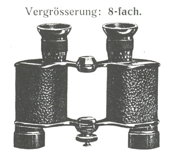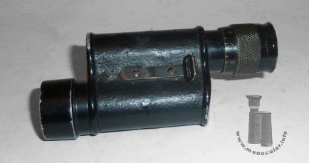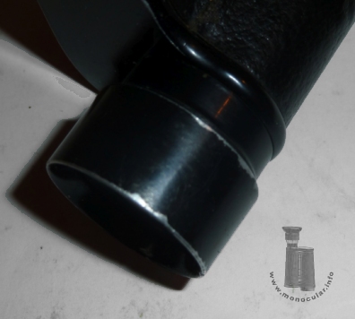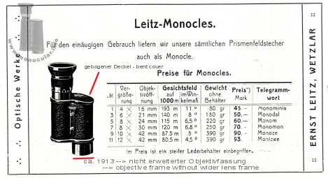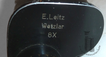| Dieses 8x24 Porro-1-Monokular ist aus der frühen Baureihe von Leitz, ca. 1908-1913 (aufgrund vorliegender Kataloge nicht später als 1911; s.u.). Es hat den typischen an einer Seite gebogenene oberen Deckel und einen Objekttubus mit erweiterter Objektivfassung. Das Aluminiumgehäuse hat eine Lederummantelung mit einer zweifach angeschraubten Trageriemenöse. Die Deckel sind unverschraubt und schwarz lackiert. Der obere ist mit "E.Leitz Wetzlar 8X" beschriftet. Die Augenmuschel aus Metall am linksseitigen Okular scheint nicht original zu sein. Es gibt eine umlaufende Dioptrienskala mit Markierungen bei Null und +/- Fünf. | This 8x24 Porro 1 monocular dates fromt he early series by Leitz - c. 1908-1913 (duet to knwon catalogues not later than 1911; see bottom of page). IT has the typical top cover plate bent on one side and a obejctive tube with a wider lens frame. The aluminium body has a leather covering with a screwed-on strap lug (two screws). The covers ar paitned black and have no screws. The top one is marked "E.Leitz Wetzlar 8X". The metal eyecup on the left-hand sided eyepiece seems not to be original. There is a full doptre scale with markings at zero and +/- five. |