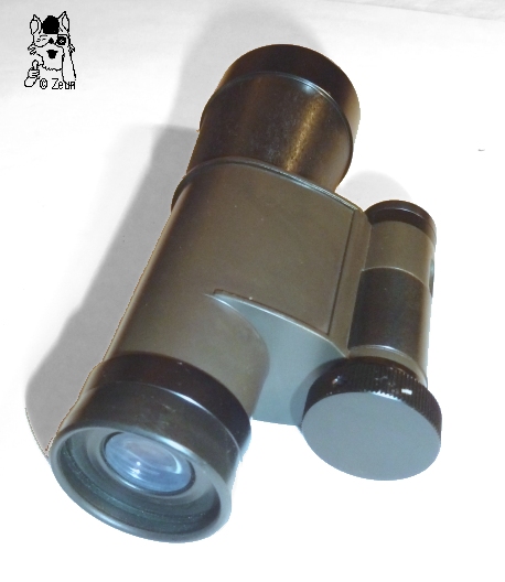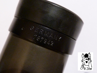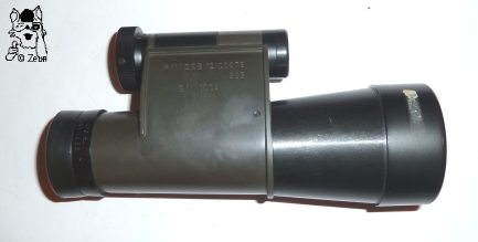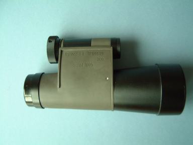 Especially made for and ordered by the NASA for their Apollo missions Leitz produced a Trinovid 10x40 monocular version which comprised the whole focusing system. It was made with a special anodised finish, and due to its internal focusing could be kept airtight, dust and moisture resistant. The serial numbers (S/N) of the known models are 1004 and 1005 plus a production number (P/N) "SEB 12100078" as well as "-303" on the right below. The latter denotes that the modification of this version was made by Leitz. Previous versions with no. -302 were modified by the NASA itself. Its field of view is 122m. The monocular is about 143mm tall. The NASA monocular is unique also in the way that it has an Uppendahl prism. |