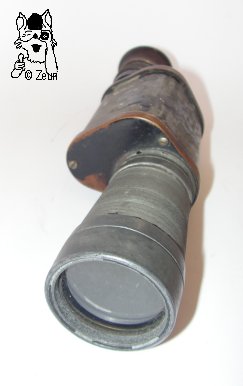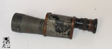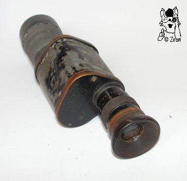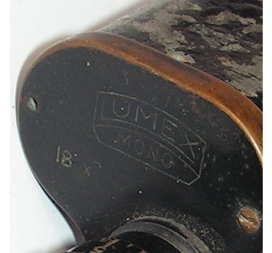 | Dieses 18x37 Monokular trägt die Modellbezeichnung "Lumex Mono" in einem Linsen- oder Prismenlogo, sowie die Vergrößerungsangabe "18x" auf dem oberen Deckel. Das Glas stammt vermutlich aus der Zeit um 1910. Die Bauart lässt auf ein deutsches oder französisches Fabrikat schließen. Die Bezeichnung "Mono" köntne außer für Monokular auch für die Magdeburger Photofirma "MONO-WERK Rudolf Chaste" stehen, da hier auch Ferngläser vertrieben wurden. Das rechtsseitige Okular hat eine Geradführung bei der Fokussierung. Das Gehäuse und der Objektivtubus sind nicht mehr ummantelt oder lackiert. Die Dioptrienskala reicht von + bis - 10. Die Augenmuschel ist aus Bakelit. | This 18x37 monocular is labeled on its top cover with model name "Lumex Mono" within a lens or prism shaped logo as well as "18x" for its power. The glass dates from around 1910 probably. The cosntruction features let assume it was made by a German or french maker. The inscription "Mono" could stand for "monocular" but also for the photo-company "MONO-WERK Rudolf Chaste" from Magedburg, as they also sold binoculars. The right-hand sided ocular jas a linear movement for focusing . The housing and the objective tube are not covered with leather or painted any more. The dioptre scale ranges from plus to minus ten. The eyecup ist made of Bakelite. |
