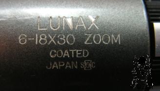 | Dieses Zoomteleskop mit Modellnamen "Lunax" kommt aus Japan, wahrscheinlich von "Showa Optical Co.", da es mit "Japan S.O.C." am dunkelgrau lackierten Tubusende beschriftet ist. Es hat eine vergütete Optik und lässt sich mit dem Drehstück am Auszugstubus (schwarz geriffelt und silbern glatt) von 6fach bis 18fach zoomen. Der Auszugstubus ist silbern-blank und dient zum Fokussieren. Der mausgraue Hauptubus hat eine dunkelgraue Fassung für die 30mm Objektivlinse. Für beide Enden gibt es Schutzkappen aus Plastik. Außerdem ist ein Reißverschluss-Köcher aus Kunstleder vorhanden. | This zoom telescope named "Lunax" was made in Japan probably by "show Optical Co.", as it is marked "Japan, S.O.C." at its dark grey end part of its main tube. Optics are coated. It can be zoomed from 6x to 18x by turning the black knurled and silvery-flat part of the draw tube. The draw tube is polished chrome and used for focusing. The mouse grey main tube has a dark grey end frame to hold the 30mm objective lens. There are two lens caps made of pülastic and a zippered synthetic öleather case. |