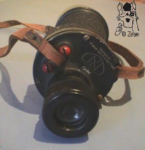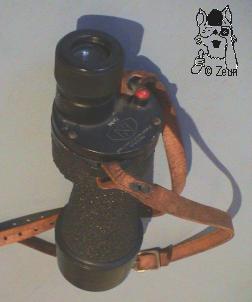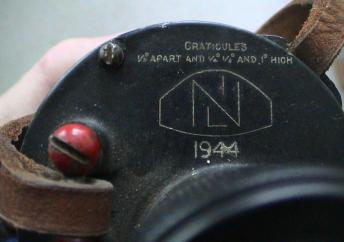 | Dieses 7x50 Monokular wurde in Lizenz zu den 7x50 Gläsern von Ross, London von Nottingham Instruments Limited (NIL im 'Ross'-Linsenlogo) gefertigt. Es trägt die Jahreszahl 1944 sowie neben einer Deckelschraube das "broad arrow"-Zeichen (s. 1. Foto vordere Schraube) und weist aufgrund der Beschriftung zur Strichplatteneinteilung und der roten Schrauben zur "Abdichtung gegen Feuchtigkeit" auf dem oberen Deckel weitere Merkmale eines Militärglases auf. Die Kennzeichnung der Strichplatteneinteilung lautet: "Graticules 1/2° apart 1/4° 1/2° and 1° high". Eine Strichplatte im Okularteil ist allerdings nicht mehr vorhanden. Möglicherweise wurde auch die Objektivlinse ersetzt, da diese bereits (blau) vergütet ist. |