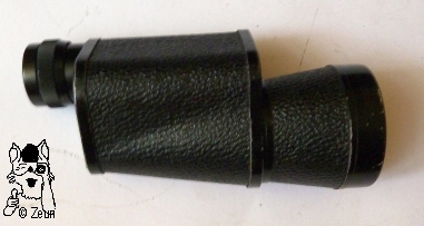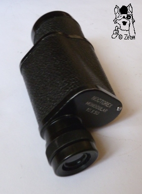 | Dieses typische Porro-1 Monokular mit der Bezeichnung "Noctorex Monocular 10x50" und blauer Vergütung kommt aus japansicher Produktion, was der "Passed" Aufkleber des JTII nachweist. Außerdem gibt es am unteren Deckel die Kennzeichnung "YCO", die möglicherweise für Yashica Co. steht. Die Deckel sind einfach verschraubt, das Gehäuse hat einen strukturierten Hartgummiüberzug und eine eingegossene Trageriemenöse. Das linksseitige Okular hat eine Dioptrienskala von +2 bis -4. Die Augenmuschel ist aus Plastik. Der konische Objektivtubus hat innen mit einem eingeschraubten trichterförmige Blendschutz verlängert. Am Boden des passenden Lederköchers ist "JAPAN" eingestempelt. | This typical porro 1 monocular with markings "Noctorex Monocular 10x50" and blue coating originates from a Japanese production, also shown through the "Passed" lable by the JTII. The lower cove rplate is also marked "YCO" which might stand for Yashica Co. . The covers have one screw, and the housing has a textured ebonite covering as well as a cast-in strap lug. The left-hand sided eyepeice comes with a dioptre scale ranging from +2 to -4. The eyecup is made of plastic. The conical tube is is prolonged inside with a screwed-in funnel shaped ray-shade. The bottom of the matching leather case is stamped "JAPAN". |