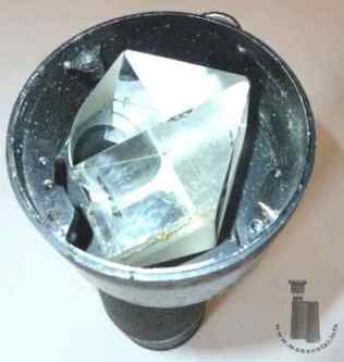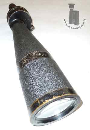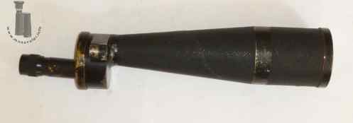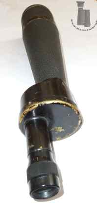 The "Officine Galileo" company (toady: Selex) was founded 1864. It made various scientific instruments throughout the years, some were optical devices. The 20x80 spotting scope depicted here may have some military origin. It comes with a porro 2 prism system and a air-spaced objective lens with a 80mm aperture. The conical and following straight objective tube are covered with textured ebonite. The other brass parts are lacquered black. The eyepeice has a dioptre scale ranging from + to - 5, and a plastic eyecup. The prism housing has a mounting lug which looks like a part of a binoculars bridge. Yet, this mount would have been on the wrong side regarding a binoculars with extended objectives. Moreover, there are no traces of a sawn-off bridge on the objective tube. So, we can assume that the 20x80 was attached to some tripod or so with this lug. The cover plate is marked wiht the OG initial logo and "Officine Galileo" within a lens outline, and below it says "20x80". |