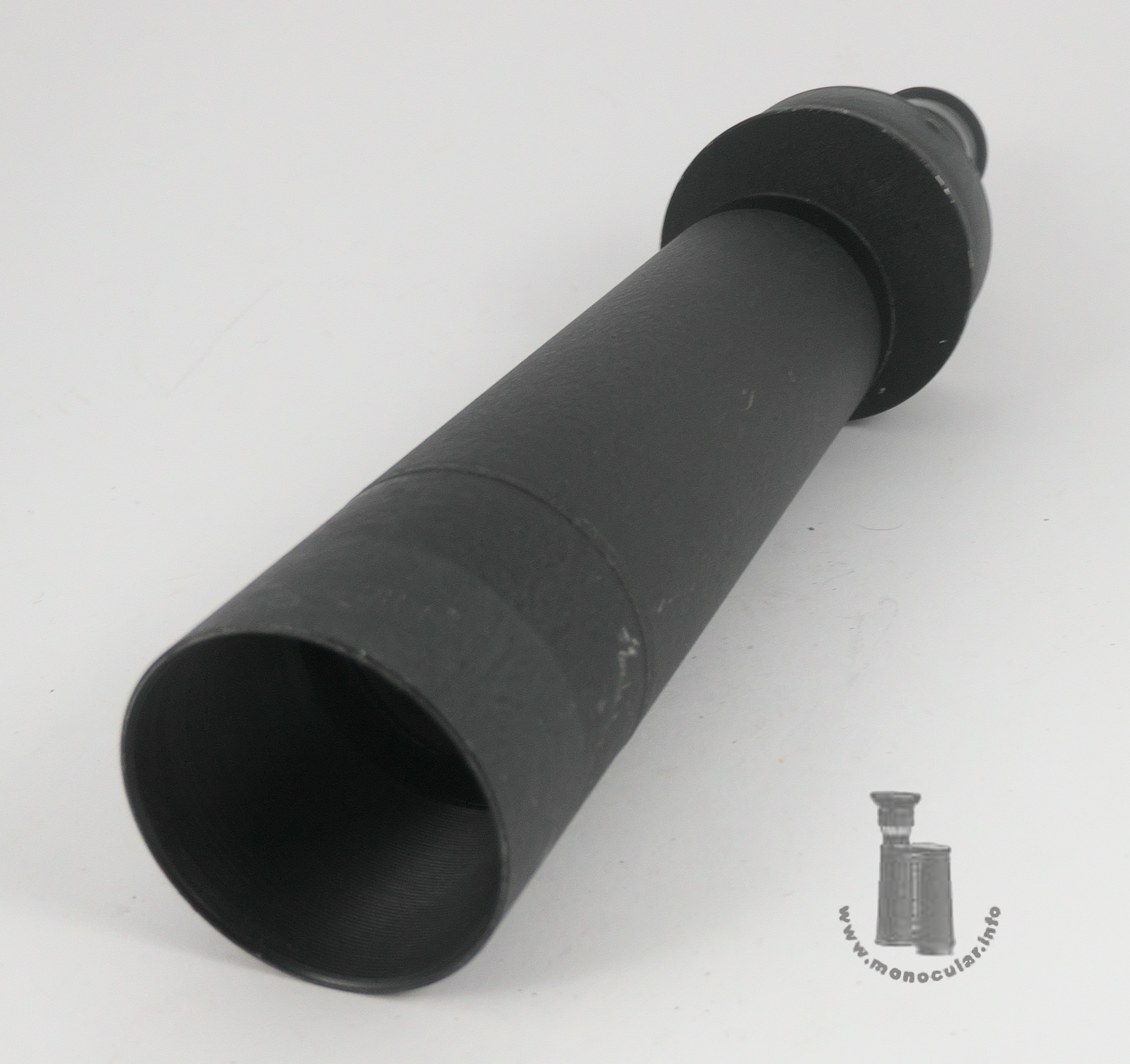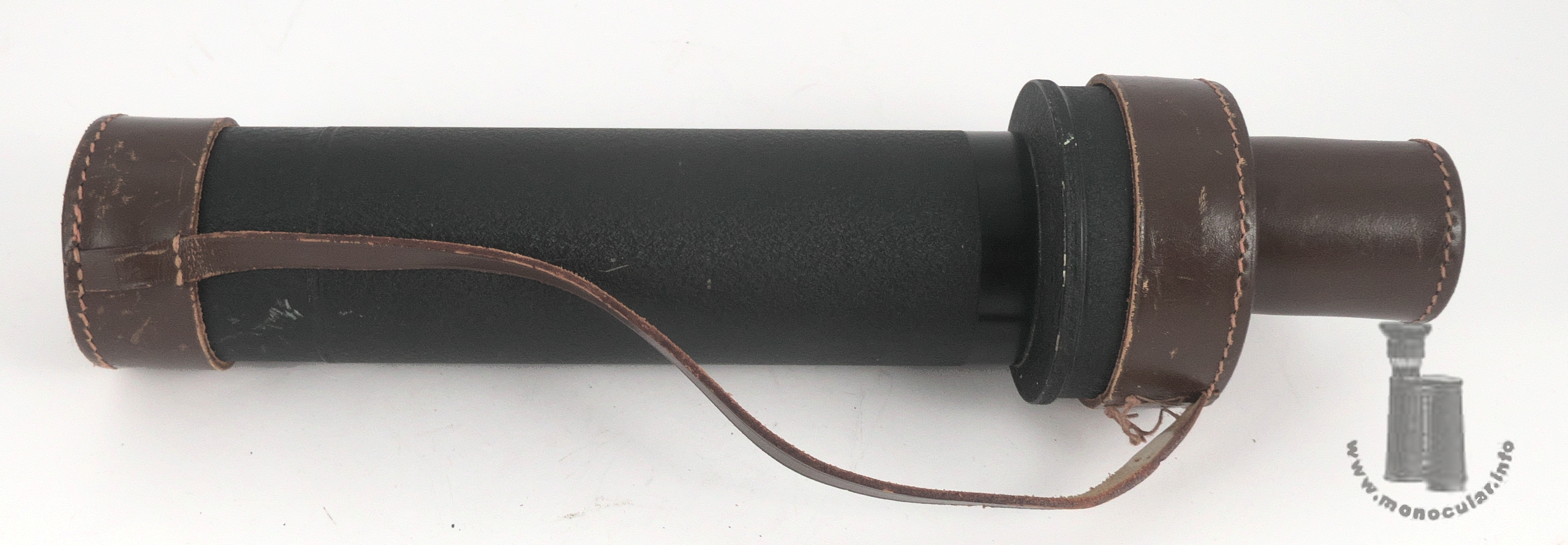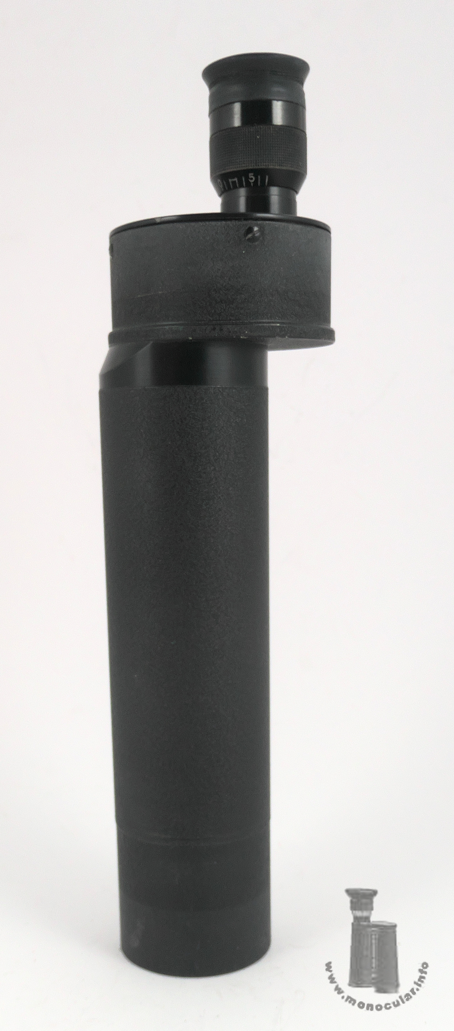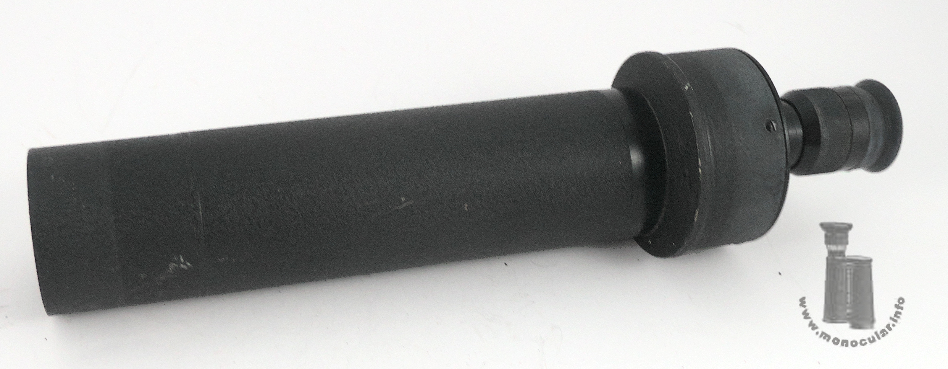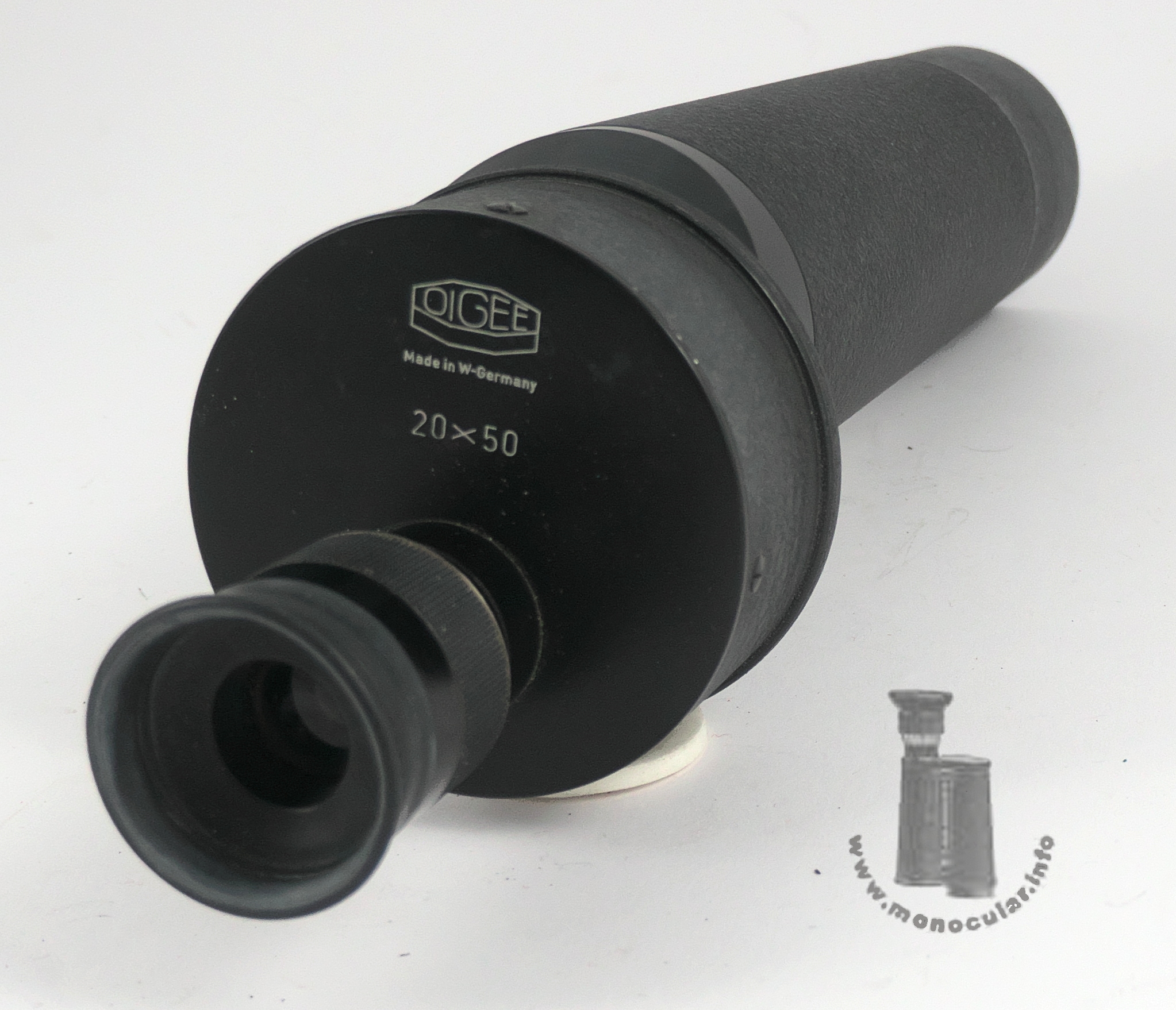 | Dieses Kleinspektiv 20x50 von Oigee hat in der runden Prismendose ein Porro-II-Prismensystem. Da das Linsenlogo nur mit Oigee ohne Ortsangabe und mit "Made in W-Germany", zudem blau vergütet ist, wurde es nach 1945 in den westdeutshcen Werken in Osterode hergestellt. In einer Preisliste von 1958 (Friedrich K. Lorenz, Wiesbaden) wird es als Modell "Observator" unter Teleskopen bezeichnet. Es besteht aus einem Hauptubus, einem Verbindungsring, der zu m versetzten runden Prismengehäuse angeschrägt ist, der Prismendose und einem Okular mit einer Dioptrienskala von + bis - 7, gekennzeichnet bei 0 und +5/-5. Die Augenmuschel aus für Brillenträger zurücklappbarem Weichgummi ist an einem Plastikringaufgesetzt. Der Tubus und Prismengehäuse sind mit einem grau-schwarzem Rauhlack lackiert. der Gehäusedeckel ist schwarz lackiert, seitlich am Gehäuse vierfach verschraubt und neben den obigen Angaben auch mit den wErten "20x50" beschriftet. | This 20x50 spotting scope from Oigee features a Porro II prism system in its round prism case. Since the lens logo is only printed with Oigee, without a town name, and with "Made in West Germany," moreover blue-coated, it indicates that it was manufactured after 1945 in the West German factory in Osterode. In a 1958 price list (Friedrich K. Lorenz, Wiesbaden), it is referred to as the "Observator" model among telescopes. It consists of a main tube, a connecting ring tapered to the offset round prism housing, the prism case, and an eyepiece with a diopter scale from + to -7, marked at 0 and +5/-5. The eyecup, made of soft rubber and foldable for eyeglass wearers, is attached to a plastic ring. The tube and prism housing are painted with a gray-black rough lacquer. The housing cover is painted black, screwed four times on the side of the housing and, in addition to the above information, is also labeled with the values "20x50". |
