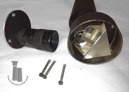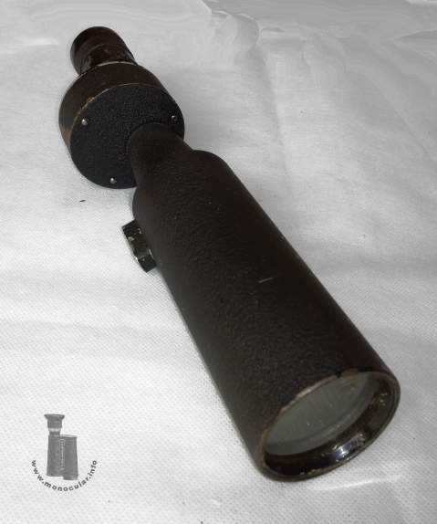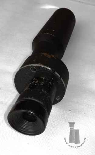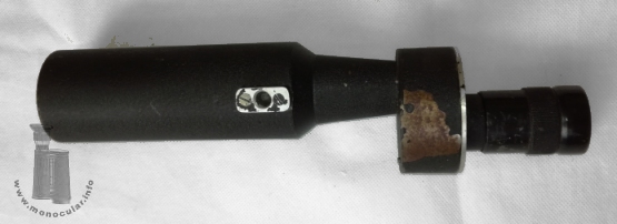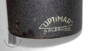 | Von dem Salzburger Kamerahersteller Optimar stammt dieses seltene Monokuar mit längerem Objektivtubus und einem Porro-2-Prismensystem. Die optischen Spezifikationen lassen sich als 7x44 messen (vgl. 8x42 bei fernglasmuseum.at). Ob es eine Sonderanfertigung des Hauses oder eine Kleinserie war, ist nicht bekannt. Die Fertigung müsste zwischen 1947 und 1962 (Gründung der Firma bis zur Umbenennung) liegen. Das Aluminiumgehäuse ist mit einem Rauhlack lackiert, die Augenmuschel ist aus Kunststoff, die Dioptrienkennzeichnung ist lediglich Null, Plus und Minus, und am Gehäuse ist ein aufgeschraubter Stativadapter. Am Objektivende ist am Rand die Beschriftung "Optimar Salzburg" | This rare monocular was amde by the camera maker Optimar in Salzburg (AT). It has a long slender objective tube and a Porro II prism system. Wehn measuring the specifications are 7x44 (cf. 8x42 at fernglasmuseum.at). It is unknowns whether this is a signle special cosntruction or was made as a small series. Yet, it must date from between 1947 and 1962 (foundation year until year of changing name). The aluminium hosuing is covered with crinkle paint, the eyecup is made of plastic, and the dioptre scale is only marked zero, plus and minus. There is a screwed-on tripod adaptor on the tube. On the end of the straight objective tube "Optimar Slazburg" is inscribed. |