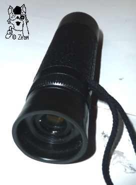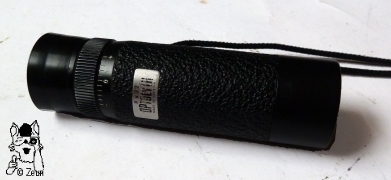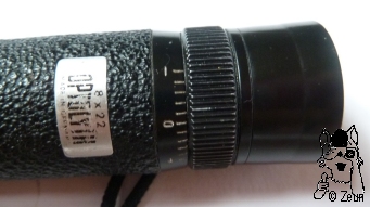 The Optolyth 8x22 is a Schmidt-Pechan prism monocular in cylindrical shape. The plastic and metal housing is coverd with some rough paint, and has a tiny tin labelling plate. The dioptre scale on the top rim of the tube is marked from plus to minus 5, but only inscribed at "0", "+" and "-". There is a milled focusing ring, which moves the ocular lens system inside without turning the soft rubber eyecup. The ocular lens is coated lilac, the objective lens is coated green. The 8x22 is 97mm long, 28mm in diameter, and weighs 70g with its strap. |