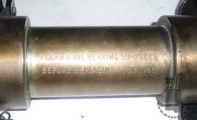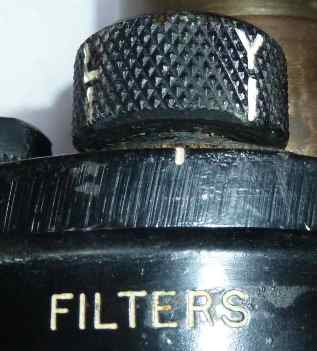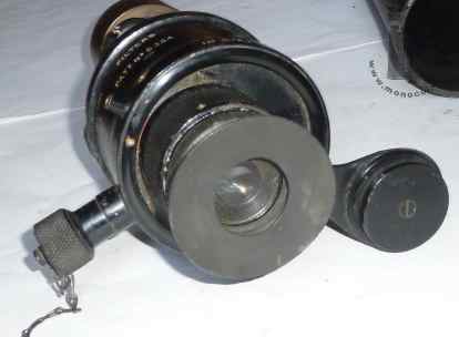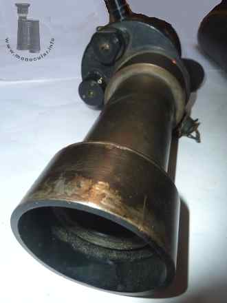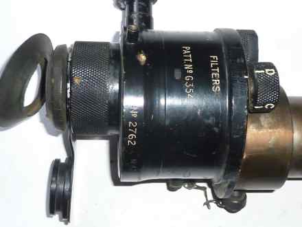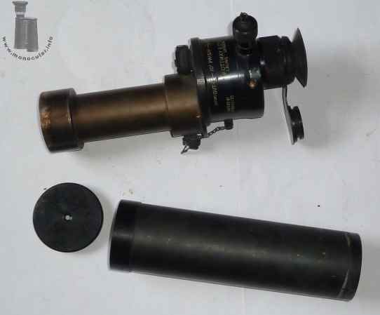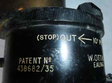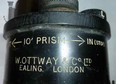 | Eine ähnliche Konstruktion wie das Ross 7x50 Monocular hat das mit Pattern G354 bezeichnete 7x45 Prismenzielfernrohr von W. Ottway & Co. Ltd. . Das Prismengehäuse ist am oberen Rand mit dem "broad arrow" sowie einem "W" daneben "A" über "T" sowie No. 2762 und dem NPL-Prüfzeichen gekennzeichnet; weiterhin ist es mit dem Firmennamen und der Patent No 438682/35 beschriftet. Am Boden des Gehäuses sind zwei Drehknöpfe, einer für die Filter (Bezeichnung "Filters" am Gehäuse) und einer ein einschwenkbares 10' Prisma (Gehäusebeschreibung: "(Stop) OUT <-- 10' PRISM --> IN (Stop)" ). Das Filterrad ist mit "C L Y D" gekennzeichnt. Dies steht für die Filter "clear" (klar), "light" (leicht grau), "yellow" (gelb) und "dark" (abgedunkelt). Das einschwenkbare Prisma dient wahrxcheinlich beim Ausrichten der Geschütze eine zusätzliche Feuerhöhe zu erreichen, ohne das das Fernrohr weiter geschwenkt werden muss. Der gerade Tubus ist mit "Clean and oil bearing surfaces before replacing body tube" beschriftet, ein Hinweis zur "Reinigung und Einölen der tragenden Oberflächen bevor das Hauptrohr angebracht wird". Bei diesem Exemplar lässt sich das Rohr nicht mehr ohne weiteres aufschieben. | A similar cosntruction like the Ross 7x50 Monocular is used for the 7x45 prism telescope marked Patt. G354 and made by W. Ottway & Co. Ltd. On its upper rim ring the prism housing is marked with the broad arrow and a "W" next to letter A over a T as well as No. 2762 and the NPL inspection sign. Further inscriptions are the comnpany's name and "Patent No. 438682/35". The bottom of the housing holds to wheel knobs, one to change filter glasses (denoted 'filters' on the hosuing), and the other to swing in a 10' prism - inscriptions on the housing are: "(Stop) OUT <-- 10' PRISM --> IN (Stop)" ). The filter knob is marked "C L Y D", abbreviations for "clear", "light", "yellow", and "dark". The swin-in prism serves to add an elevation without tilting the monocular further more when aligning and aiming the guns. Giving isntructions the straight tube is engraved "Clean and oil bearing surfaces before replacing body tube". The main tube cannot be slipped on the objective barrel readily now. |