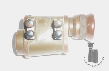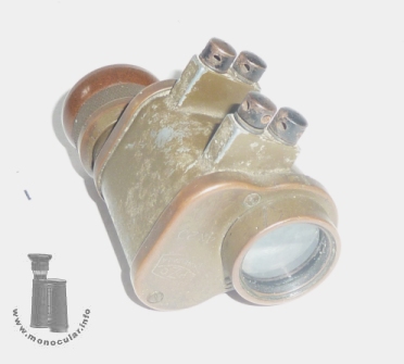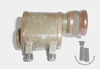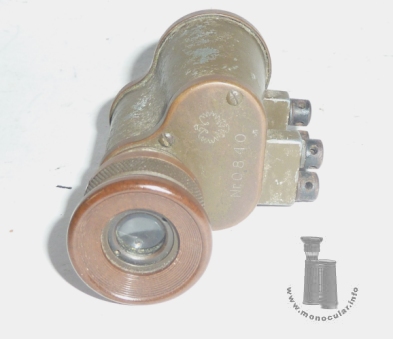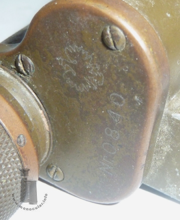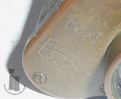 This 4x20 monocular was made by the Warzaw Optical Plant PZO (Polskie Zaklady Optyczne). It looks like mdoel made for "signaling devices" as other 4x20s with such mounting feet are. The objective cover plate is marked "PZO WARSZAWA" within the maker's logo and 4x20. The cover on the eyepiece end is marked with the Polish eagle and the serial numbre (here: 0840). The right-hand sided eyepeice has a full dioptre scale and a 1/1 eyecup made of plastic . All parts are lacquered greenish-brown. |