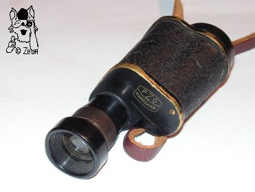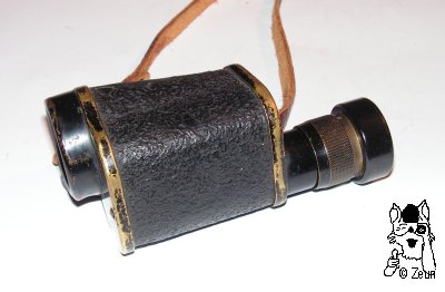 | Von der Warschauer Optikfabrik PZO (Polskie Zaklady Optyczne) kommt dieses 6x30 Monokular. Das Achromat-Logo auf dem Deckel ist mit "PZO WARSZAWA" beschriftet. Andere Kennzeichnungen gibt es nicht. Das 6x30 könnte aus der Zeit des 2. Weltkriegs stammen. Das Gehäuse ist mit einem anthrazit-farbenen Rauhlack ummantelt, die Messingdeckel und die Objektivfassung sind schwarz lackiert. Die Dioptrieskala reicht von plus bis minus Fünf. Die Plastikaugenmuschel ist evtl. nicht die originale. | Made by the Warzaw optical plant PZO (Polskie Zaklady Optyczne) this 6x30 monocular bears a achromat lens logo inscribed with "PZO WARSZAWA", but no other markings. The 6x30 may date from WWII times. The housing is covered with a crinkle paint finish, the brass cover plates and the objective frame are painted black. The dioptre scale ranges from plus to minus five. The plastic eyecup does not look to be the original one. |