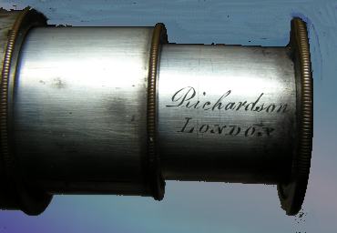 Richardson London 3 Draw Spy GlassThis monocular spy glass was made by Richardson London (19th cent.). It has three draw tubes and a bell shaped main tube with leather covering. The last and smallest draw is engraved with the optician name in a cursive script.The objective lens is 38mm in diameter. Magnification is about 3.5 times. The main tube measures 48mm at its end, the three draw tubes have diameters of 25.5mm, 21.5mm and 17.2mm, The metal eyecup is 25mm in diameter. The spy glass is 46mm long closed and 93mm long extended. It weighs 76g. |