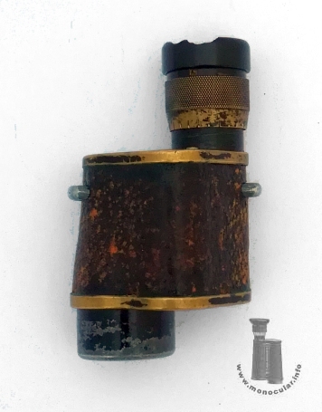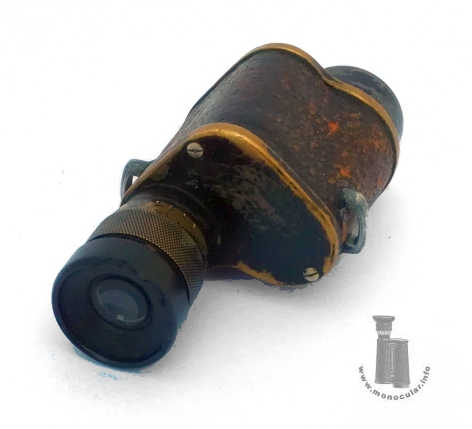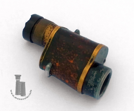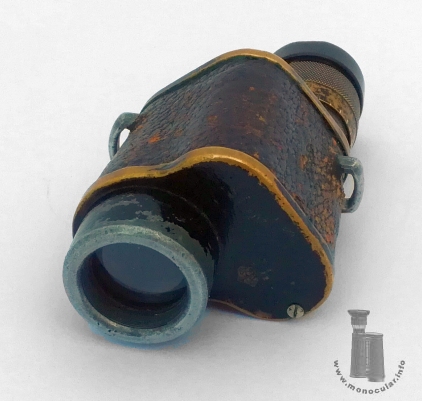 | Durch die Augenmuschel ist es noch etwas länger als später: 103 bis 111 mm. Die Messingdeckel sind oben zweifach, unten einfach veschraubt. Die Objektivfassung ist aus Aluminium. Das Gehäuse ist oben 49x49 mm und unten 54x54 mm breit. Die Objektivfassung ist 33 mm, das Okularstück 26 mm, der glatte Fokussierungsteil 31 mm und die Augenmuschel 33 mm im Durchmesser. Das Glas und wiegt 262 g. | Because of this eyecup type the monocular is longer than later: 103 to 111 mm. The brass covers have two screws on the top and one on the bottom plates. The housing measures 49x49 mm at its top and 54x54 mm at its bottom. The black lacquered aluminium objective frame is 33 mm, the eyepiece 26 mm, the knurled focusing ring 31 mm, and the eyecup 33 mm in diameter. The 6x24 weighs 262 g. |
