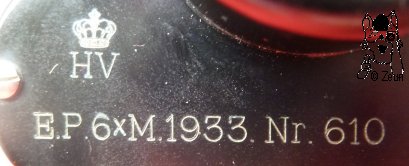 | Dieses Spindler & Hoyer 6x24 Monokular wurde jeweils in einer 350 Stückzahl 1933 und 1935 von der Dänischen Armee importiert, nachdem die ersten 20 Probeexemplare, Modell Spindler & Hoyer 6x24 mit HT Kennzeichnung, beim Dänischen Militär Zustimmung fanden (vgl. a. S&H 6x24 (Sw. Armee). Der obere Deckel ist mit dem S&H-Logo, "6x24" sowie der Seriennummer 93972 gekennzeichnet. Der untere Deckel ist mit der "Dänischen Krone" und darunter den Buchstaben "HV" für Hærens Våbenarsenal (= Armee Waffenarsenal). Weiterhin hat das Dänische Militär folgende Beschriftung angebracht: E.P. 6x M.1933 Nr. 558 (= Enkelt Prismekikkert, 6x Modell 1933, Nr. 558 [Jahreszahl und Militränummer]). Das Monokular stammt also aus der zweiten Bestellung von 1935 (alle Gläser wurden mit Modell 1933 markiert). Vgl. hierzu M. Simonsen: Hærens Håndkikkerter, in Vabenhistoriske Aarborger 2004, S. 75ff. und S. 98. |