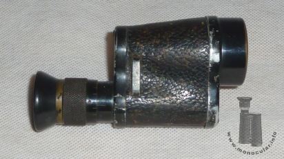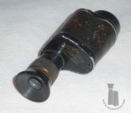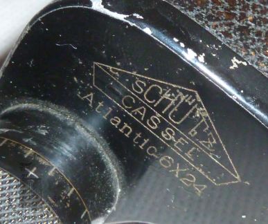 | Das "Atlantic" 6x24 Modell von Schütz Cassel (vor 1926) ist insofern besonders, da es entgegen aller anderen Schütz Gläser kein Porro 2, sondern ein Porro 1 Prismensystem verwendet. Es ist aus einem Messingokular und -objektiv mit schwarz lackierten Aluminiumdeckeln und Objektivverblendung sowie Alugehäuse. Die Augenmuschel ist aus Bakelit, die Dioptrienskala an dem linksseitigem Okularstück ist komplett umlaufend und bei Null sowie Fünf gekennzeichnet. Die Deckel sind einfach verschraubt. Es gibt eine eingegossene Trageriemenöse. Das Objektiv ist in einer Messingfassung mit Exzenterringen zum Justieren. Dies liegt unter einer schwarz lackierten aufgeschraubten Objektivverblendungsring Der obere Deckel ist mit dem Logo, den Werten und dem Modellnamen, der untere Deckel mit Nr. 31467 beschriftet. |