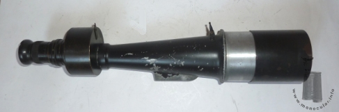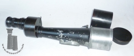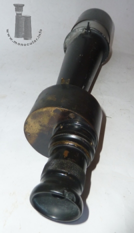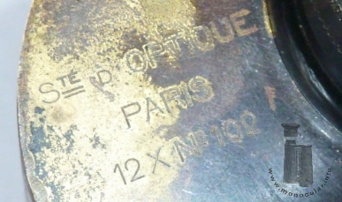 | Das 12x60 Teleskop der Société d'Optique hat eine Schwalbenschwanzmontierung, einen ausziehbare Sonnenblende und ein Kimme-und-Korn-Visier. Das Korn lässt sich umklappen. Es ähnelt sehr dem Carl Zeiss 15x60 und könnte ebenso zur Zeit vor und um den 1. Weltkrieg von der französischen Armee als Beobachtungsfernrohr für Signalgeräte oder ähnliches genutzt worden sein. Das Okular ist mit einer Strichplatte mit Skala von 0-30 links und rechts von der Mitte aus versehen und ließ sich mit einem Ring drehen. Das Okular hat eine Dioptrienskala. Offensichtlich wurde versucht, am Okular sowie Objektiv Reparaturen vorzunehmen, wobei das Strichplattenglas beschädigt wurde. Diese hat ein Skala von links nach rechts von 60 über 0 bis 60. Der dreifach verschraubte Deckel ist mit "STE D'OPTIQUE PARIS 12x No 102" beschriftet. | The 12x60 telescope by the Société d'Optique has a dove-tail mounting, an extendable sunshade and notch and bead sight. The bead can be folded down. The scope resembles much the Carl Zeiss 15x60 and at that time about WWI could also be used as an observation telescope with signalling apparatuses or a similar instrument by the French Army. The eyepiece comes with a reticle being marked from zero to 30 to the left and right. It once could be rotated with a ring on the eyepiece. The ocular has a diopte scale. Obviously someone tried to repair the eyepiece and the objective at some time which led to a crack in the reticle glass. This ghas a scale line from left to right ranging from 60 over 0 to 60. The top cover of the housing is inscribed "STE D'OPTIQUE PARIS 12x No 102". |