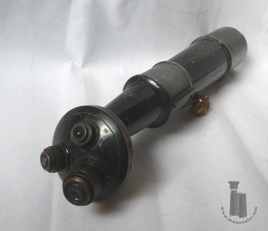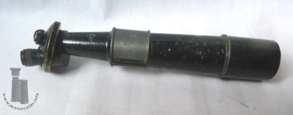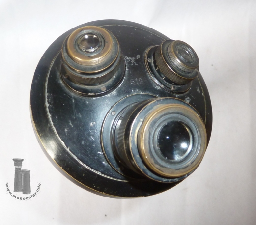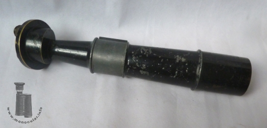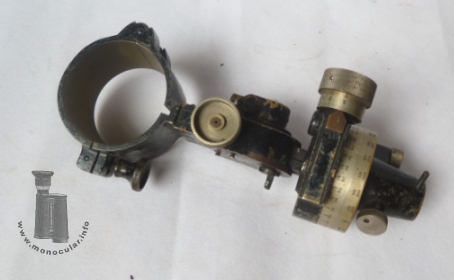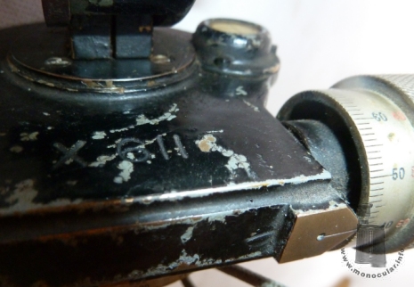 | Dieses Beobachtungsfernrohr mit Triple-Okularrevolver trägt zwar keinen Fiormennamen, dürfte aber von der Societe d'Optique et Mécanique de Haute Précision (SOM) stammen. Der Revolverdeckel ist mit den 3 Vergrößerungen 15x, 25x und 32x graviert sowie mit einem "X" in der Mitte und der Nr. 612. Korrespondierend dazu befindet sich die Kennzeichnung "X 611" auf dem Richtkreis des Stativadapters an zwei Stellen und an mehreren Teilen innen. Das Modell "X" ist für gewöhnlich von E. Krauss als 15x23x30x80 Modell gebaut worden. Der Objektivdurchmesser hier ist nur 70mm. Die am Tubus befindliche Aufnahme für die Statvischelle ist gleich; es ist eine Metallleiste, die in eine Nut der Schelle greift. Das Monokular hat eine ausziehbare Sonnenblende. Die Prismendose ist größer als bei den Krauss-Modellen und auch stabiler mit dem konischen Objektivtubus verbunden. Der Okularrevovler wird mit einem Überwurfring gehalten, hat aber keine Arretierungen für die jeweilige Okularauswahl. Die Okulare haben jeweils eine umlaufende Dioptrienskala mit Beschriftung von +5 bis -5. Die Strichplatte hat ein kleies Fadenkreuz und außen horizontal sowie vertikal 5 Teilstriche, die mittig von Null über 5 zu 10 gehen. | This observation telescope with atriple eyepeice revolver has no maker's mark on it, but is likely made by the Societe d'Optique et Mécanique de Haute Précision (SOM). The revovler cover is isncribed with the three magnifications 15x, 25x and 32x as well as an "X" in the centre and nubmer 612. Corresponding to that an "X 611" mark is twice on the aiming circle of the tripod adapter and on the inside of several parts. The model "X" was usually built by E. Krauss as a 15x23x30x80 model. The objective diameter here is only 70mm. The mount for the tripod clamp on the tube is the same; it is a metal rail, which locks into the nut of the clamp. The monocualr has an extendable sunshade. The prism box is larger than on the Krauss models and moreover more solidly connected to the conical objective tube. The eyepeice revovler is secured by an retainer ring, but has no click stops for the chosen power. The eyepeices have a full dioptre scale with markings at +5 to -5. The reticle is a small cross-hairs plus five horizontal and vertical dividing lines t the periphery. The lines start from a middle zero line in both directions marking 5 and 10. |