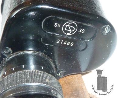 There are two examples of the 6x30 model I have. Each bears the interwoven intitals "DS" which stand for the company founder Daniel Swarovski, differ in the inscriptions on the top cover plate. Both versions were issued with or without coated optics. The first one with serial number 21466 (sale box marked "DV" = doublec coated) or 23705 (uncoated) is an early 6x30 model (probably 1950s). The inscriptions are in a recessed stretched oval of the cover plate. Left of the initials we have "6x", and to the right "30". Below that, there is another oval with the serial number. At some time metal strips were attached to the cover plate screws next to the ocular and objective of the #23705 model. The upper one has a new strap lug and runs under the original strap lug, then soldered with the lower metal strip which carries a tripod thread. These and the original metal parts are painted black, whereas the housing is covered with some textured anthracite lacquer. The left-hand sided ocular has a dioptre scale being marked at +/-5, and a black Bakelite eyecup. The monocualr with number 21466 has a violet-blue coating. |