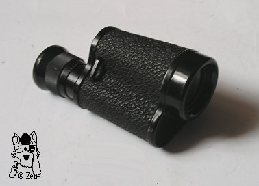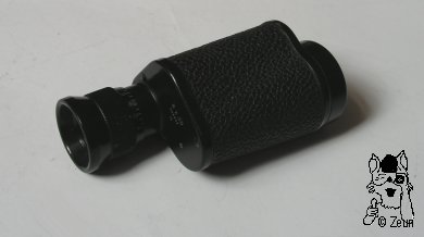 These 8x30 Swarovski monoculars have a magenta coating. Their housings are covered with textured hard rubber. The cover plates have three screws and are painted black. There is a plastic eyecup at the left-hand sided ocular. The top cover plate is marked with the interwoven initials "DS" for Daniel Swarovski as well as "8x30 902998 N" or >"8x30 915948" (no N). The dioptre scale has division lines from plus to minus ten, yet only marked at zero +5 and -5. The second version has a full dioptre scale on a wide dioptre ring. Also, the eyecup has straight sides, whereas the first model has a cone shaped eyecup. The second model is also marked "Habicht" in handscirpt letters on the bottom cover. The glass measures 105-113mm. The housing is 50x50mm at its top and 56x56mm at its bottom. The objective frame is 41mm in diameter. The eyepiece diameters are different for the two monoculars: ocular tube 24mm and 27mm; focusing part 30mm and 34mm; eyecup 34mm and 33mm in diameter. So, the second model comes with a wide angle eyepiece - its field of view is wider than with the 1st model. The monoculars weigh 206g. |