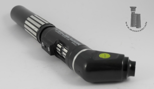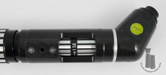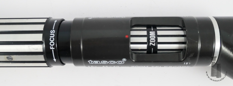 | Dieses Zoomteleskop des Vertreibers TASCO (Tanross Supply Company) wurde laut Beschriftung und Prüfaufkleber des "Japan Telescope Inspection Institute" in Japan hergestellt. Die Herstellermarke mit Z in einer Raute ist mir unbekannt. Die japanischen Herstellerkürzel (JE/B) sind nicht vorhanden. Das sich verjüngende 45° angewinkelte Okulargehäuse lässt sich auch um 45° nach links und rechts schwenken, um den Einblick von unterschiedlichen Positionen zu ermöglichen. Vor dem Okular nach einem Zierring schließt sich der Tubus mit Zoom-System an. Der Zoom lässt sich mit einer geriffelten Walze in Aussparungen oben und unten einstellen. Diese ist mit "45x ← ZOOM → 15x" beschriftet. Beide Tubusseiten sind mit "tasco® 19T 15x - 45x 40 MM ZOOM TELESCOPE Achromatic coated lens Japan" gekennzeichnet. "19T" dürfte die Modellnummer darstellen. Unten am Tubus ist ein Standard-Stativadapter angeschraubt. Der längere Objektivtubus lässt sich zum Fokussieren drehen. Er ist mit "← FOCUS →" beschriftet. | This zoom telescope from distributor TASCO (Tanross Supply Company) was manufactured in Japan, according to the label and the inspection sticker from the Japan Telescope Inspection Institute. The maker's mark, which has a diamond-shaped Z, is unknown to me. The Japanese manufacturer's initials (JE/B) are missing. The tapered 45° angled eyepiece housing can also be swiveled 45° left and right to allow viewing from different positions. The tube with the zoom system is located in front of the eyepiece after a decorative ring. The zoom can be adjusted using a knurled roller in recesses at the top and bottom. This is labeled "45x ← ZOOM → 15x." Both sides of the tube are marked "tasco® 19T 15x - 45x 40 MM ZOOM TELESCOPE Achromatic coated lens Japan." "19T" is likely the model number. A standard tripod adapter is screwed onto the bottom of the tube. The rather long objective tube can be rotated for focusing. It is labeled "← FOCUS →". |