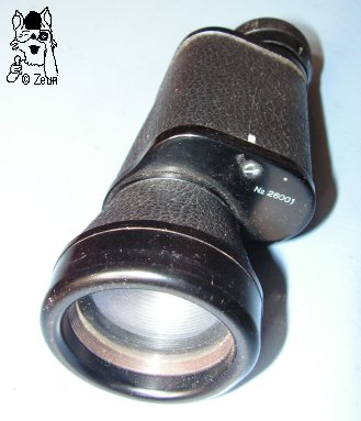 Here is a 8x40 porro 1 monocular, probably from Japanese production. The top cover is marked "Venus S.O.C." in a lgoo depicting a lying lens (side view), "8x40" and "Field 6.5° COATED" . The lower cover plate has number 26001 inscribed. This monocular has the usual characteristics of a post-war porro 1 monocular. The eyecup is missing. The monocular measures 134-410mm in length. The housing is 50x50mm wide at its top and 54x54mm at its bottom. The left-hand sided ocular is 29mm, the focusing part 34mm, the objective tube between 41mm and 54mm in diameter. The 8x40 weighs 269g. |