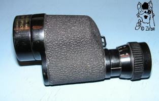 The 8x30 prism monocular by Wollensak Optical Co. (Rochester, USA) has the same shape and design as the 6x30. So, the anthracite coloured textured housing has no top cover plate, but just a rounded shoulder with a strap lug. The prism system can be pulled out after detaching the bottom cover and the ocular tube. The bottom cover has one screw and is marked "8x30 Prism Monocular made by Wollensak Rochester U.S.A.", The objective frame has a label saying "This instrument has coated optics. Clean lenses carefully". The right-hand sided ocular has a dioptre division from +2 to -4. |