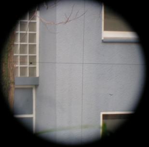 | Das Gehäuse ist aus Metall mit einem Raulack anthrazit ummantelt. Das Okularstück hat eine Plastikaugenmuschel und einen Dioptrienausgleich von +2 bis -4. Dabei handelt es sich hier um eine Geradführung des Okularsystems. Das Okular hat eine Strichplatte mit Fadenkreuz zum Anvisieren. An den Seiten des Gehäuses sind zwei Stutzen eingegossen, die zur Montage auf einem Schwenkstativ dienen. Oben am Gehäuse sind Kimme und Korn angeschraubt, sowie schräg rechts oben eine Montageschiene für die Beleuchtungseinheit, die aus einer Halterung und einem einschraubbaren Glühbirnen-Einsatz mit Batterieanschlussstecker besteht. |