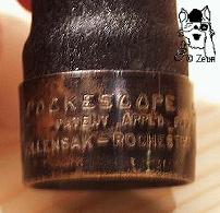 | Ein altes Pockescope Sr. (Senior) der Fa. Wollensak Rochester USA. (s.a. Pockescope Jr.) Das Gehäuse ist aus Messing mit oder ohne schwarzer Lackierung und einem silberfarbenem Okularauszug. Das Original wurde mit einem kleinen Lederfuteral geliefert. |